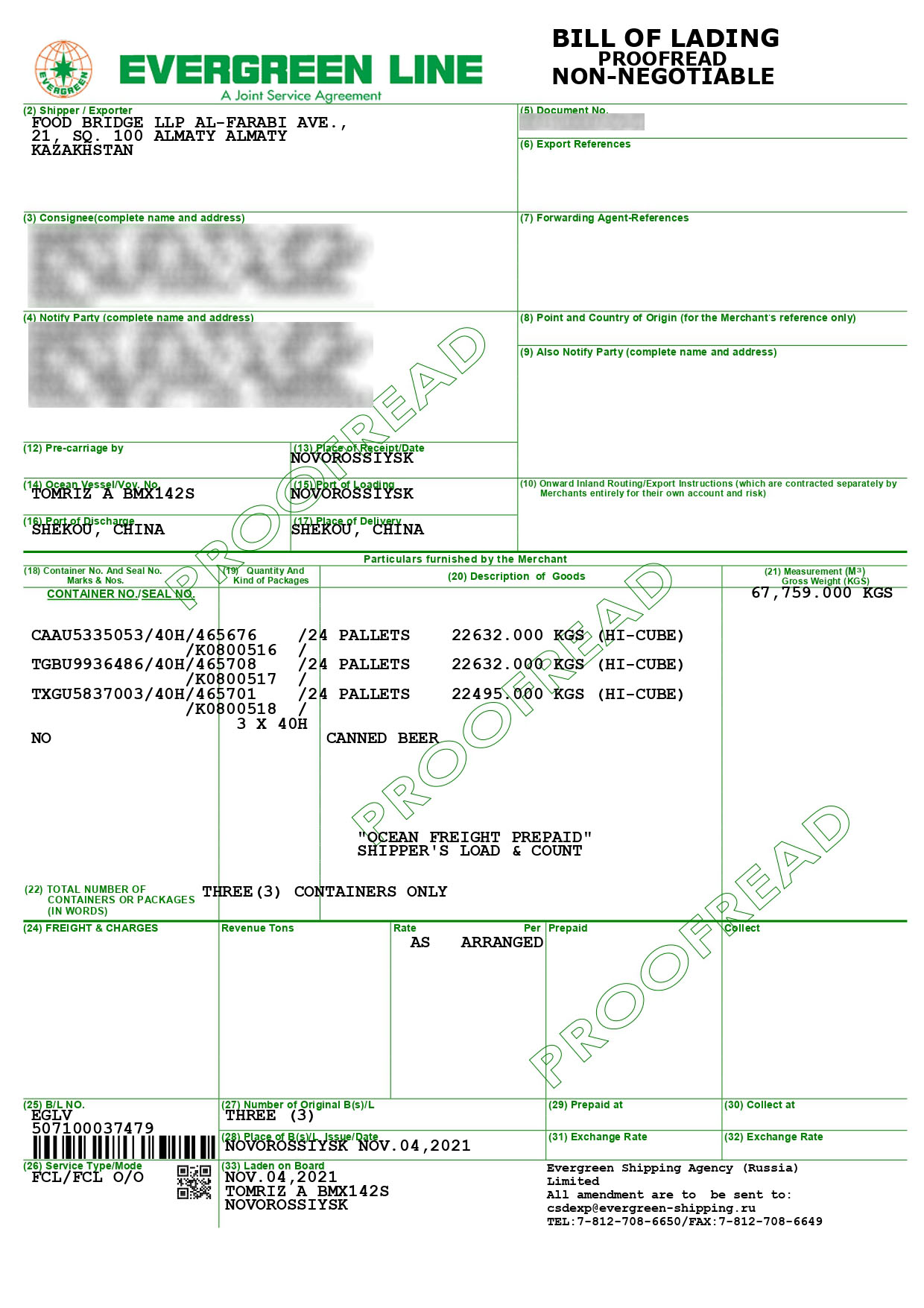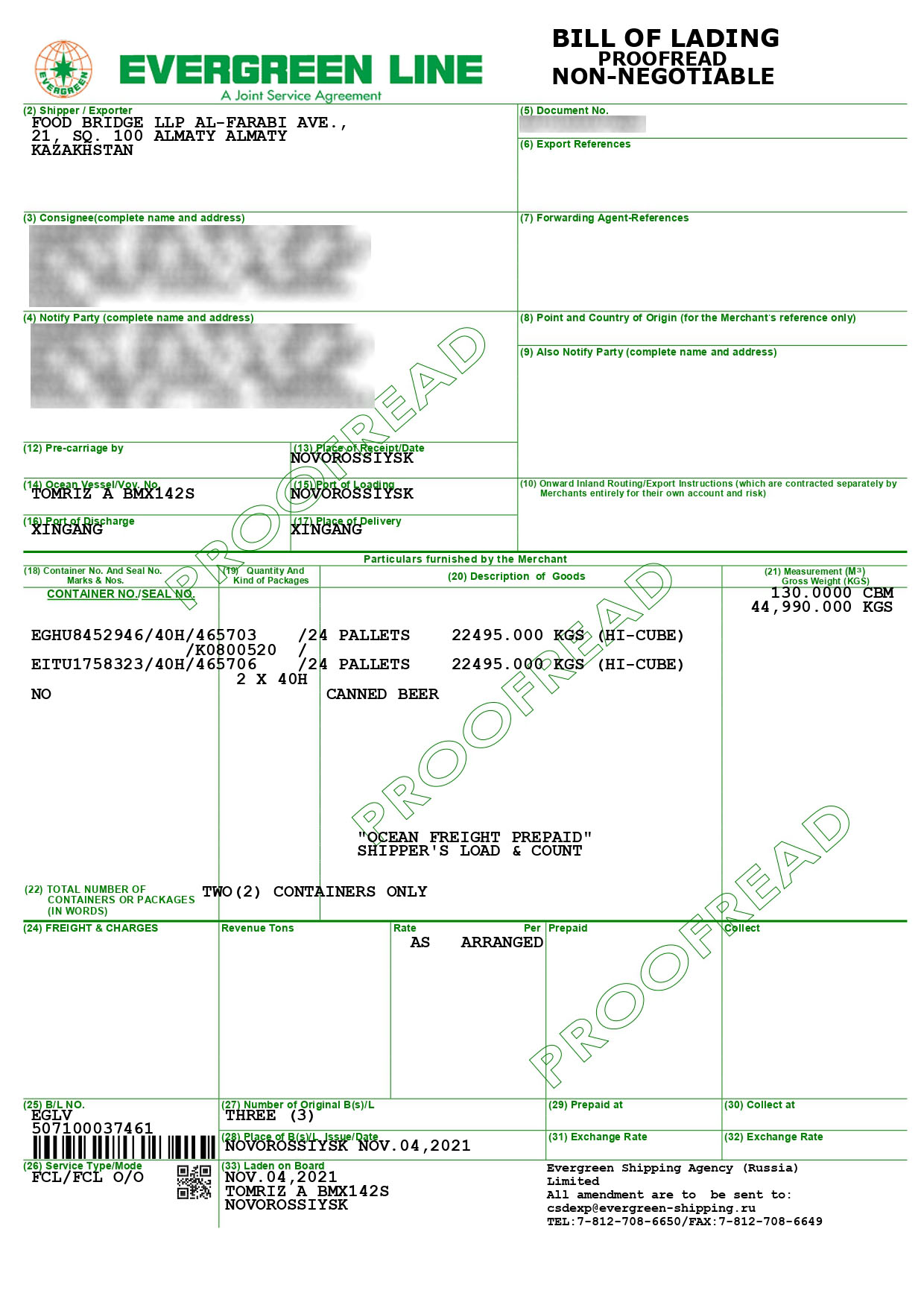 Shipment on November 4, 2021. 5 containers of beer were shipped to China.
