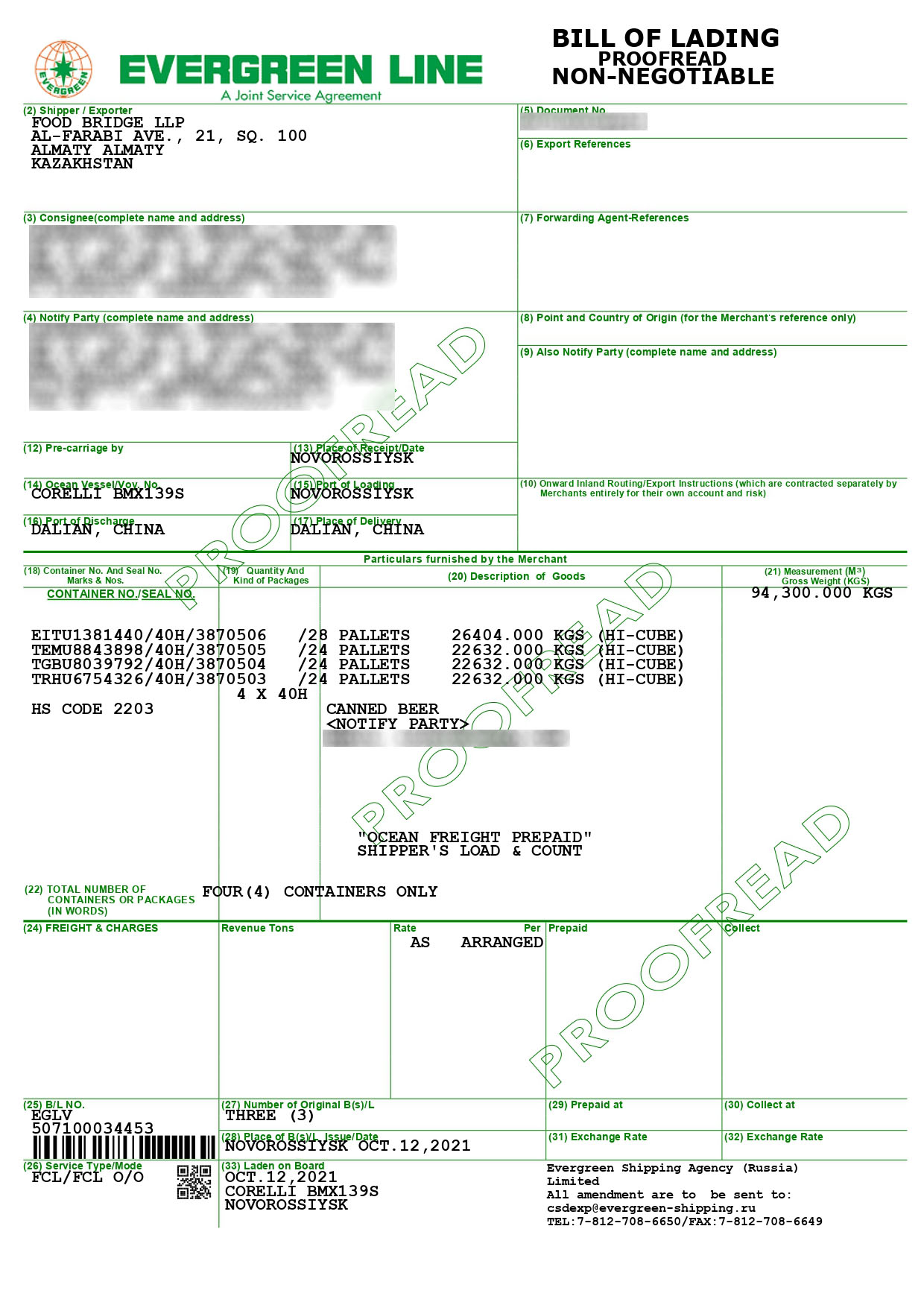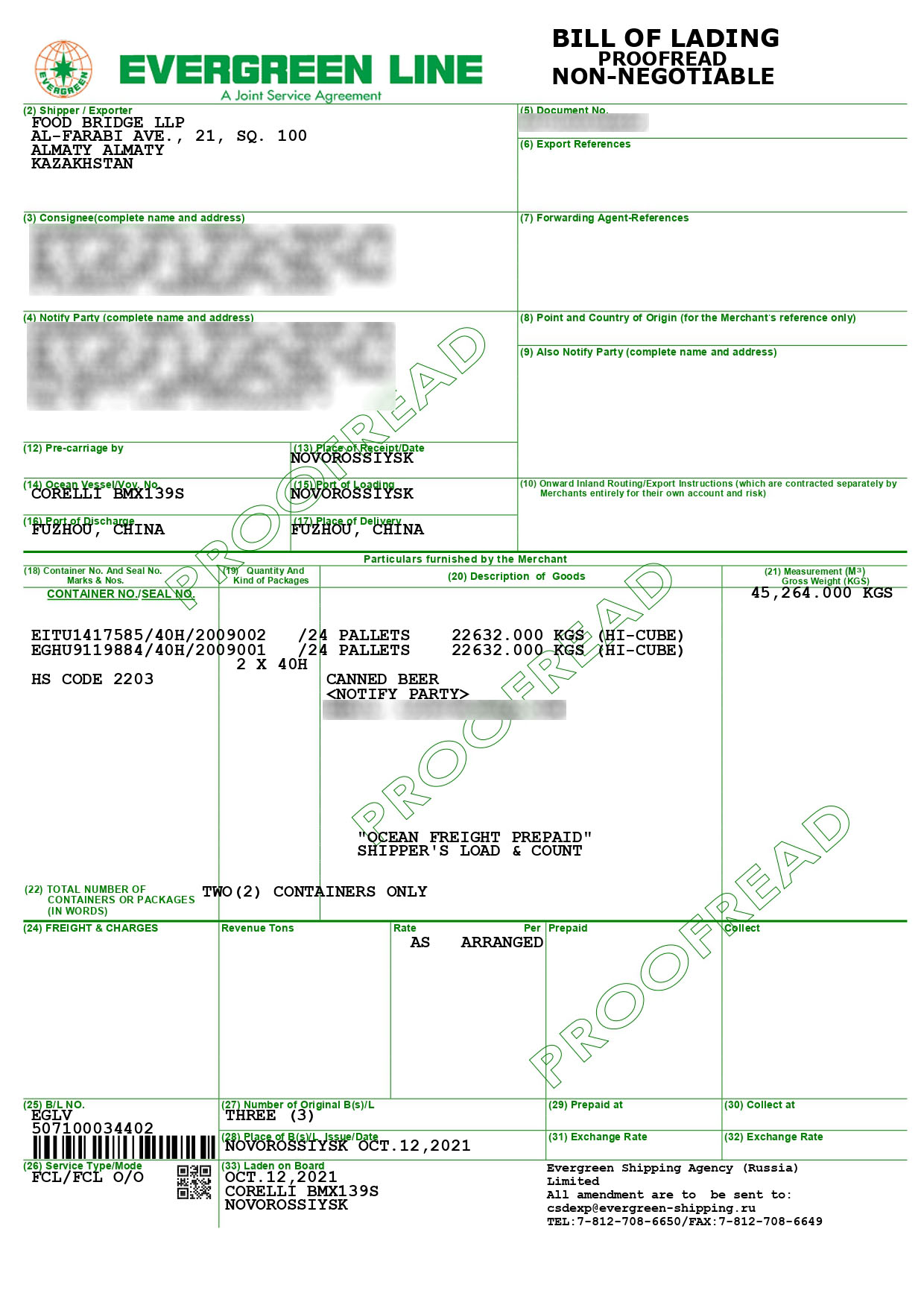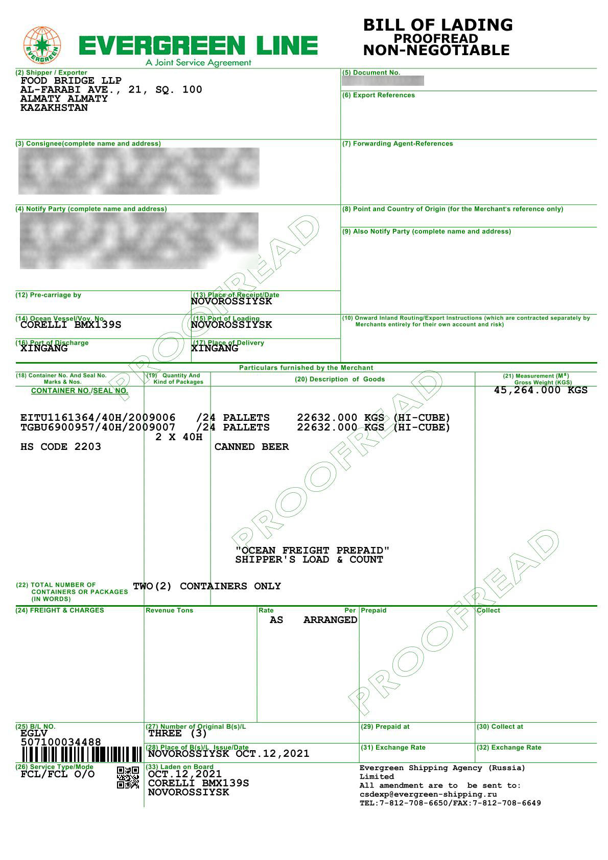 Shipment on October 12, 2021. 8 containers of beer were shipped to China.